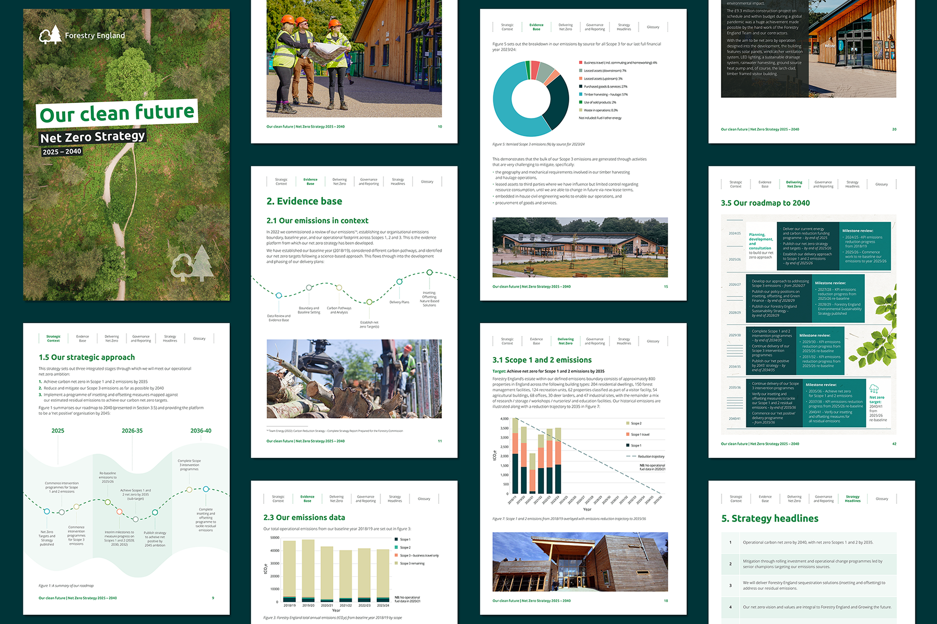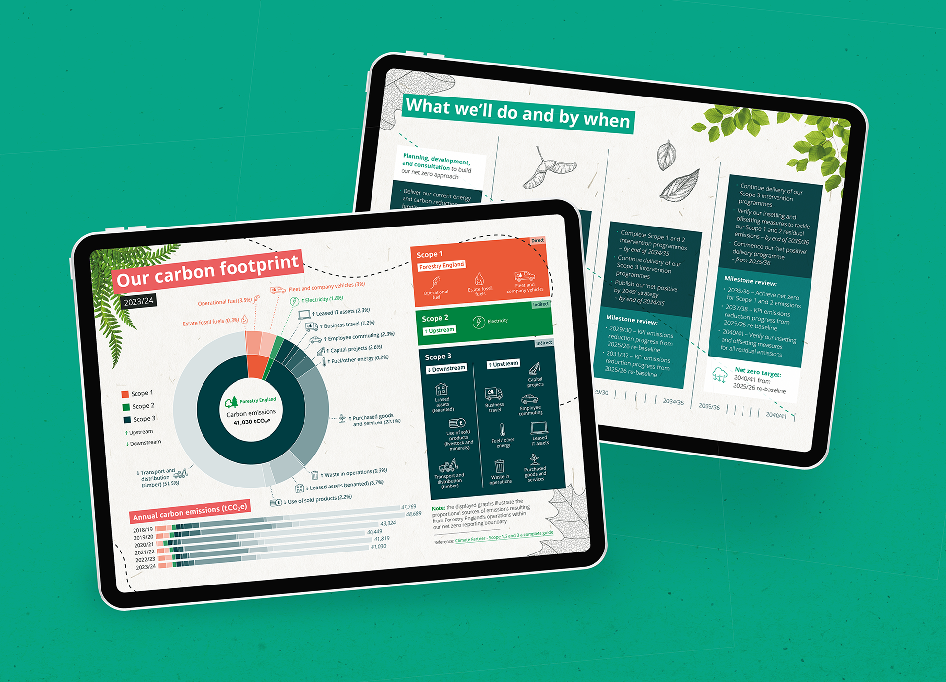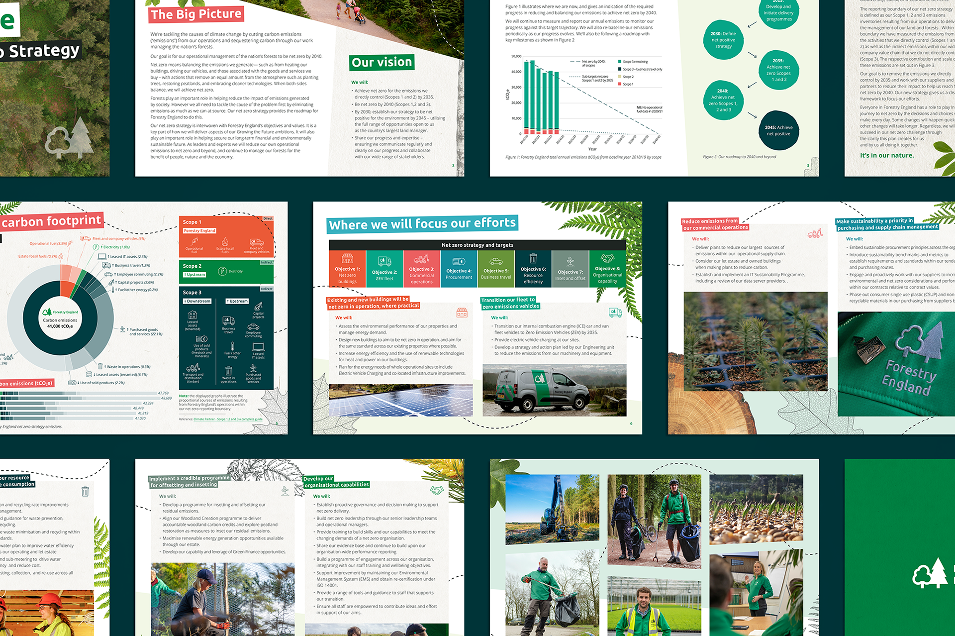 Design of Net Zero Strategy materials, including two report documents and data-led infographics. Created to present Forestry England’s pathway to net zero in a clear and engaging way.